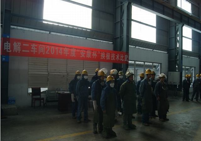 青海物產(chǎn)工業(yè)投資有限公司全面啟動(dòng)"安康杯"競(jìng)賽活動(dòng)。2014年4月15日上午電解二車間舉行了"安康杯"換極技術(shù)比武大賽。公司副總經(jīng)理張?jiān)手?,副總?jīng)理、工會(huì)主席張秉瑜,總經(jīng)理助理秦建峰出席了開幕式。
