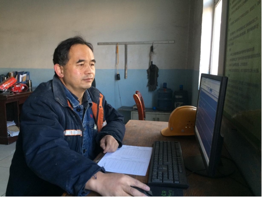 圖為:白成業(yè)(左一)在對(duì)作業(yè)長進(jìn)行現(xiàn)場培訓(xùn)