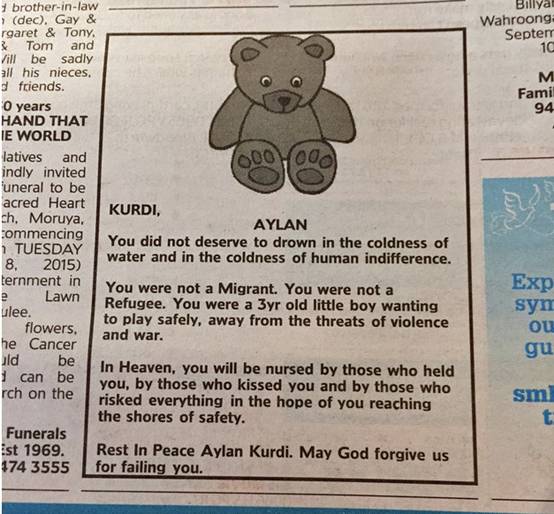 在澳大利亞,還有人在9月4日的《悉尼先驅(qū)晨報(bào)》上為小Aylan發(fā)了份訃告。