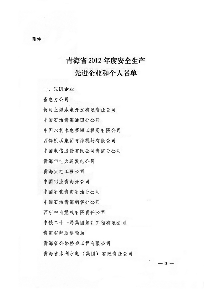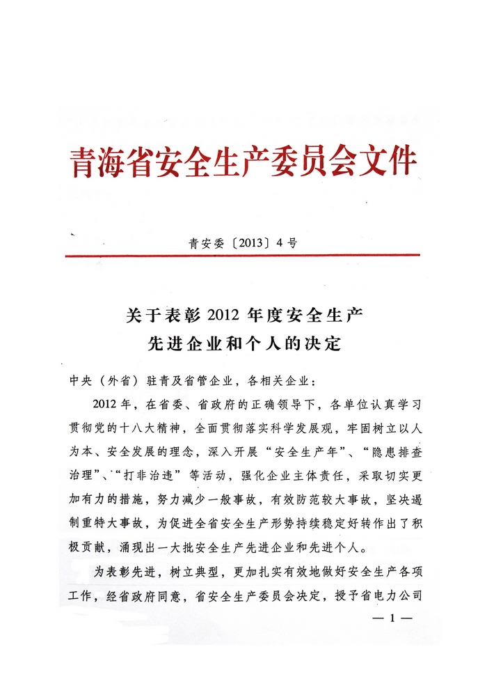 2012年,在省委、省政府的正確領(lǐng)導(dǎo)下,青海省物產(chǎn)集團(tuán)總公司認(rèn)真學(xué)習(xí)貫徹黨的十八大精神,全面貫徹落實(shí)科學(xué)發(fā)展觀,牢固樹立以人為本、安全發(fā)展的理念,深入開展"安全生產(chǎn)年"、"隱患排查治理"、"打非治違"等活動(dòng),為促進(jìn)全省安全生產(chǎn)形勢(shì)持續(xù)穩(wěn)定好轉(zhuǎn)做出了積極貢獻(xiàn)。為此,經(jīng)省政府同意,省安全生產(chǎn)委員會(huì)決定授予青海省物產(chǎn)集團(tuán)總公司"2012年度安全生產(chǎn)先進(jìn)企業(yè)"榮譽(yù)稱號(hào)。